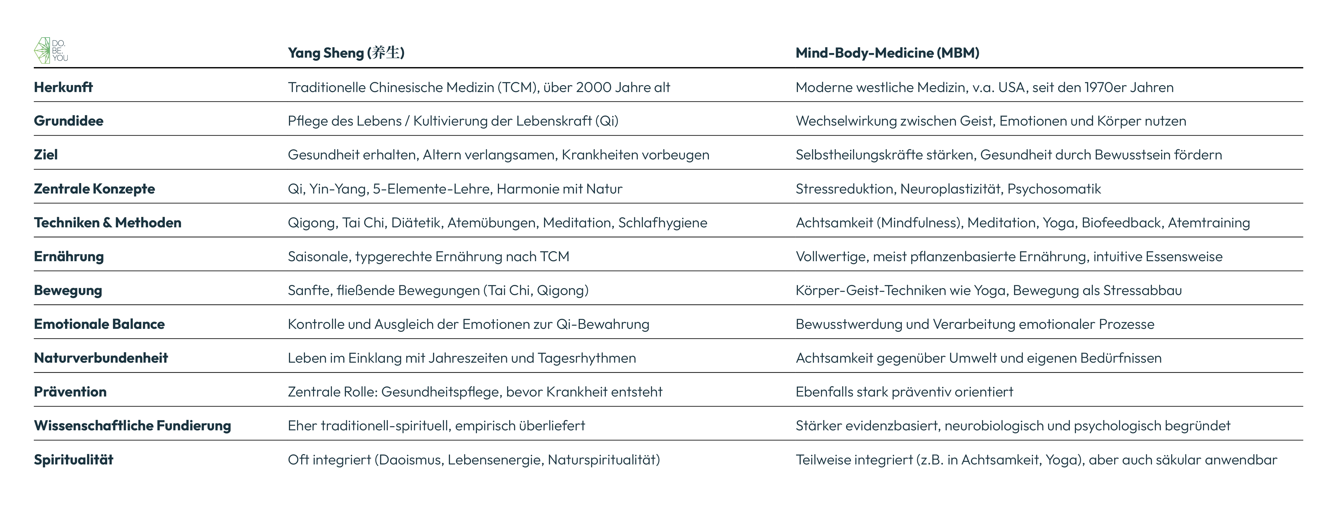 Die Mind-Body-Medizin und das Konzept des Yang Sheng aus der Traditionellen Chinesischen Medizin verfolgen trotz ihrer unterschiedlichen kulturellen Ursprünge eine sehr ähnliche Grundhaltung: Gesundheit entsteht aus dem harmonischen Zusammenspiel von Körper, Geist und Lebensweise.